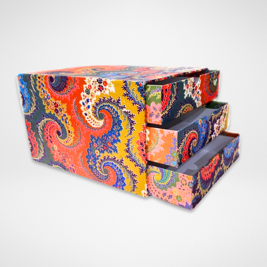Introducing our Rigid Triple Drawer Box, a symphony of strength and style for your premium products. Each drawer slides out effortlessly, providing an exclusive unboxing experience that is as memorable as it is functional. The vibrant, ornate patterns make each box a work of art, enhancing the aesthetic of what lies within.